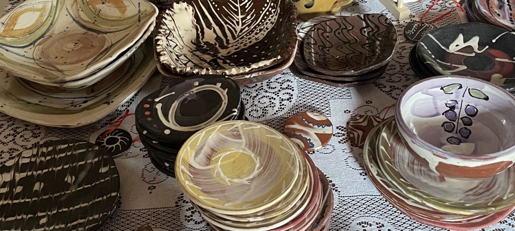 Slip Tales is an exploration and appreciation of the history and heritage of Staffordshire slipware. This was a project that I led, delivering workshops to mixed community groups with the aim of connecting them with the history of Staffordshire. We looked at large celebratory plates and slipware from The Potteries Museum & Art Gallery in Stoke-on-Trent, and the narratives entailed in the works of the Toft brothers and others. We used contemporary colourful slips to create pieces of tableware for a dinner party. While making we focused on personal narratives and tales, using the clay as a canvas for telling a story. The Dinner Party is a place of hope, as art and food can transcend barriers. The Slip Tales Dinner Party celebrates the bringing together of cultural differences and similarities in eating and food sharing traditions from around the world.